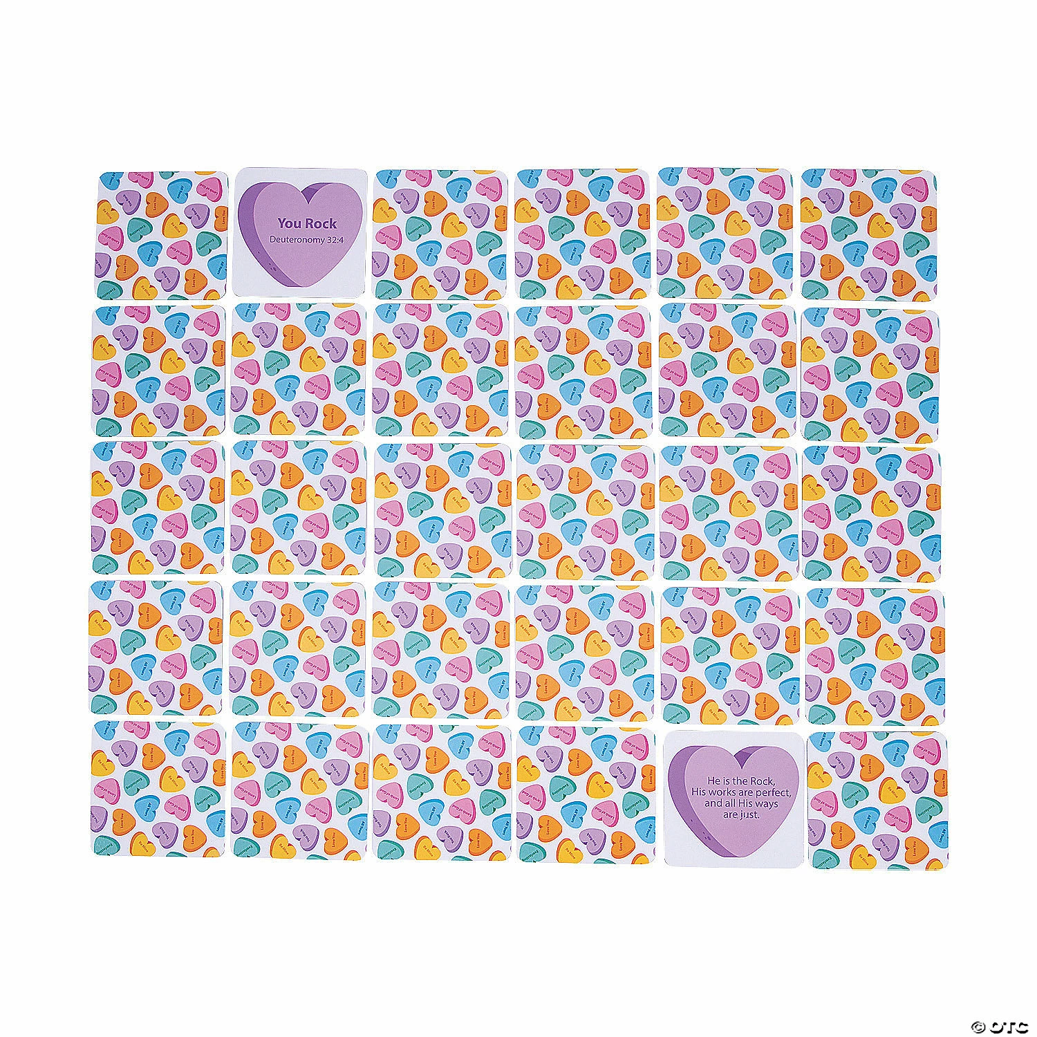 Mix up your routine with a new Sunday School game! With this group matching game, kiddos can master important Bible verses while having fun with their classmates. The matching game cards have color-coded pairs with one card printed with the verseβs title (i.e. John 3:16) and the other card printed with the full verse. The cards are designed to look like conversation heart candies, so the religious game is a fun activity for Valentineβs Day but can be used year-round, too. Playing cards come in a 5-1/4″ x 5-1/4″ x 2-1/2″ box with instructions. Cardboard. (56 pcs. per unit) 4 1/2″ Β© OTC